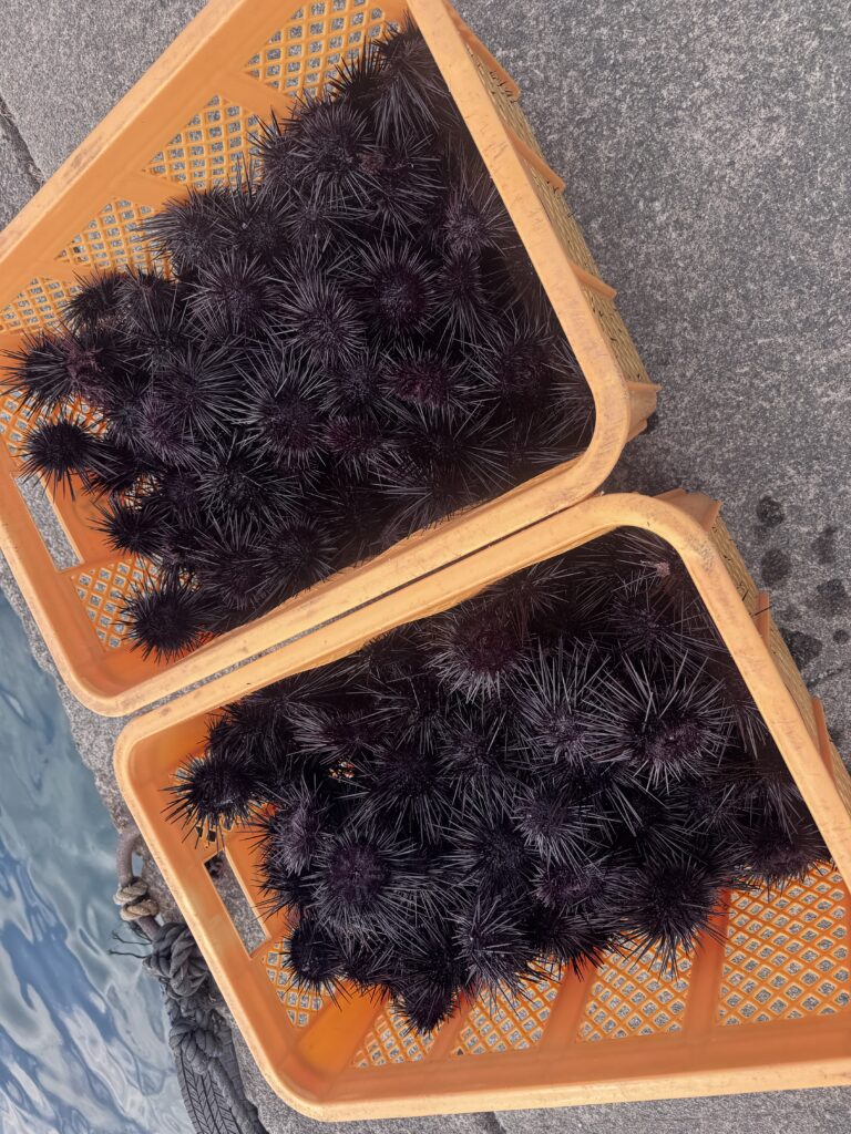 取ってきてくれたウニのカゴを引き上げる感じです(ง°̀ロ°́)ง