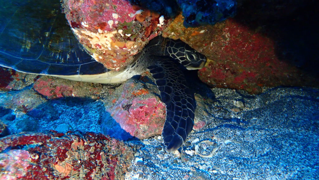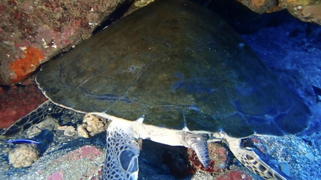 西風の日が多くなかなか堂ヶ島で潜れない日が続きますが、たまに潜るとカメに会えます!笑