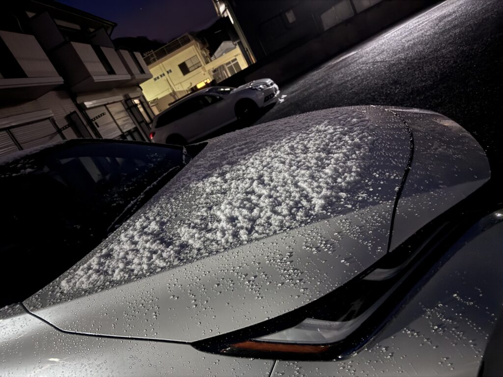 積もることはないと聞いていましたが、昨晩は車にしっかり積もってましたΣ(°д°ノ)ノ